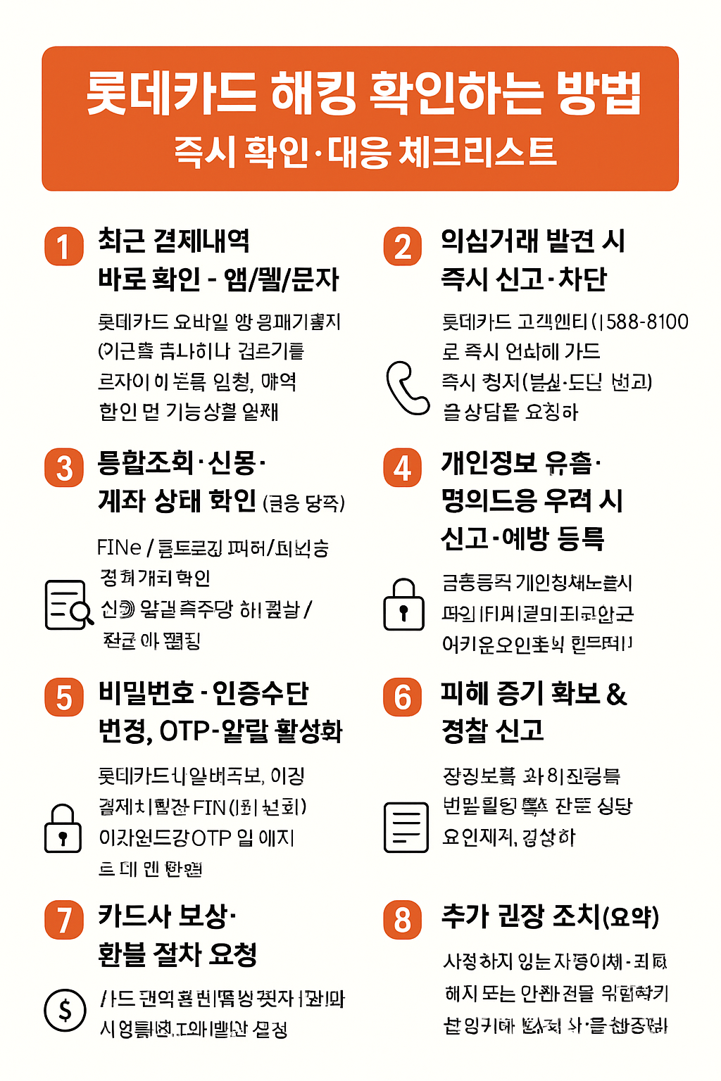 - 롯데카드 모바일 앱 또는 홈페이지에 로그인해 최근 이용내역(결제일시·가맹점·금액)을 하나하나 검토하세요. 본인이 모르는 해외승인·심야·낯선 가맹점 거래가 있으면 의심입니다.