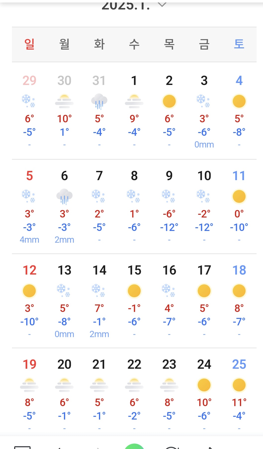 강추위는 우리나라로 부는 바람이 북서풍에서 서풍으로 바뀌는 주말 풀릴 전망으로 금요일은 5일은 아침 최저기온이 -11∼2도, 낮 최고기온은 1∼9도로 한파가 이어지겠다.